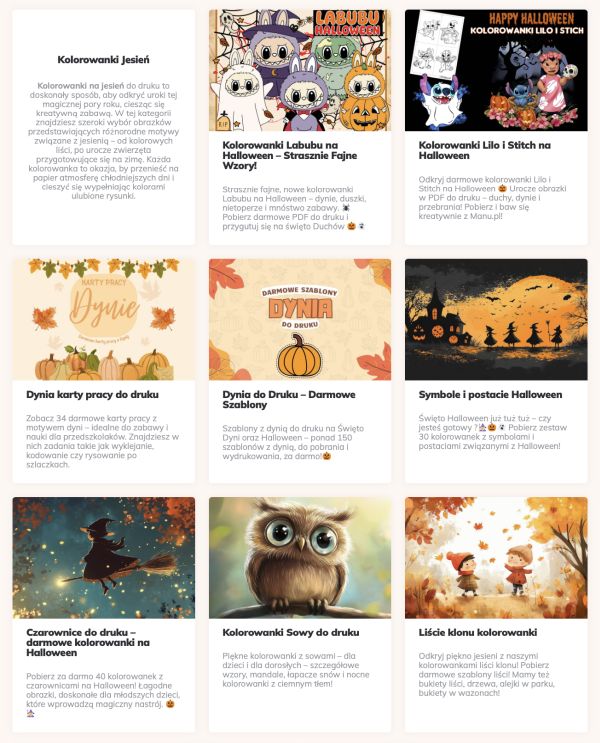 Kolorowanki jesienne i halloweenowe to coś więcej niż zwykła zabawa. To okazja, by spędzić czas razem, rozwijać wyobraźnię i tworzyć piękne pamiątki. Dzięki darmowym plikom PDF możesz szybko przygotować zestaw rysunków na wieczór z dziećmi, zajęcia w przedszkolu czy rodzinne spotkanie. Jeśli szukasz pomysłów na kreatywne spędzanie jesieni, zajrzyj na stronę manu.pl i odkryj bogatą kolekcję materiałów. Kolorowanki jesień, kolorowanki Halloween, a także specjalne wzory z dyniami czekają, by stać się częścią Waszej zabawy.