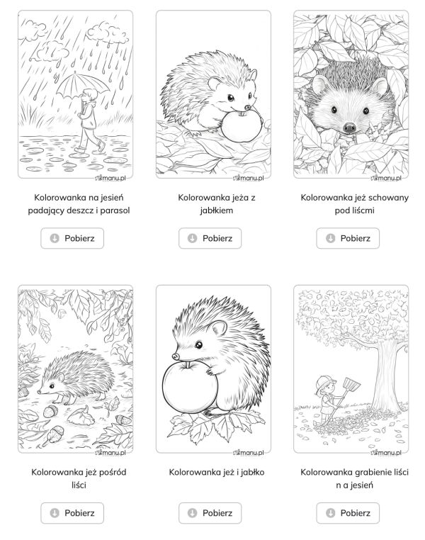 Jesienne kolorowanki – liście, wiewiórki, jeże, padający deszcz